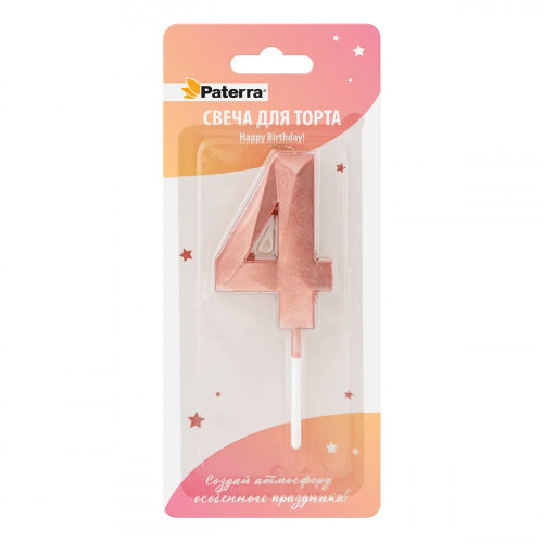 Свеча для торта "HAPPY BIRTHDAY" розовое золото, цифра 4, в блистерной упаковке 24шт/кор