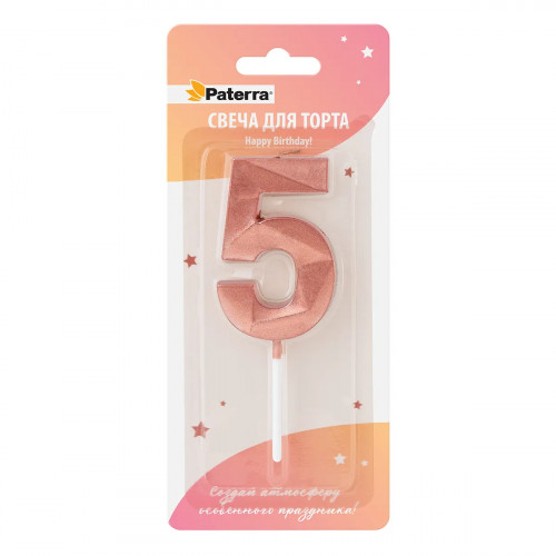 Свеча для торта "HAPPY BIRTHDAY" розовое золото, цифра 5, в блистерной упаковке 24шт/кор