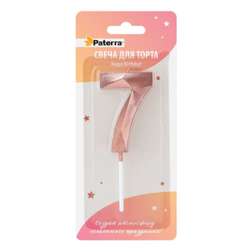 Свеча для торта "HAPPY BIRTHDAY" розовое золото, цифра 7, в блистерной упаковке 24шт/кор